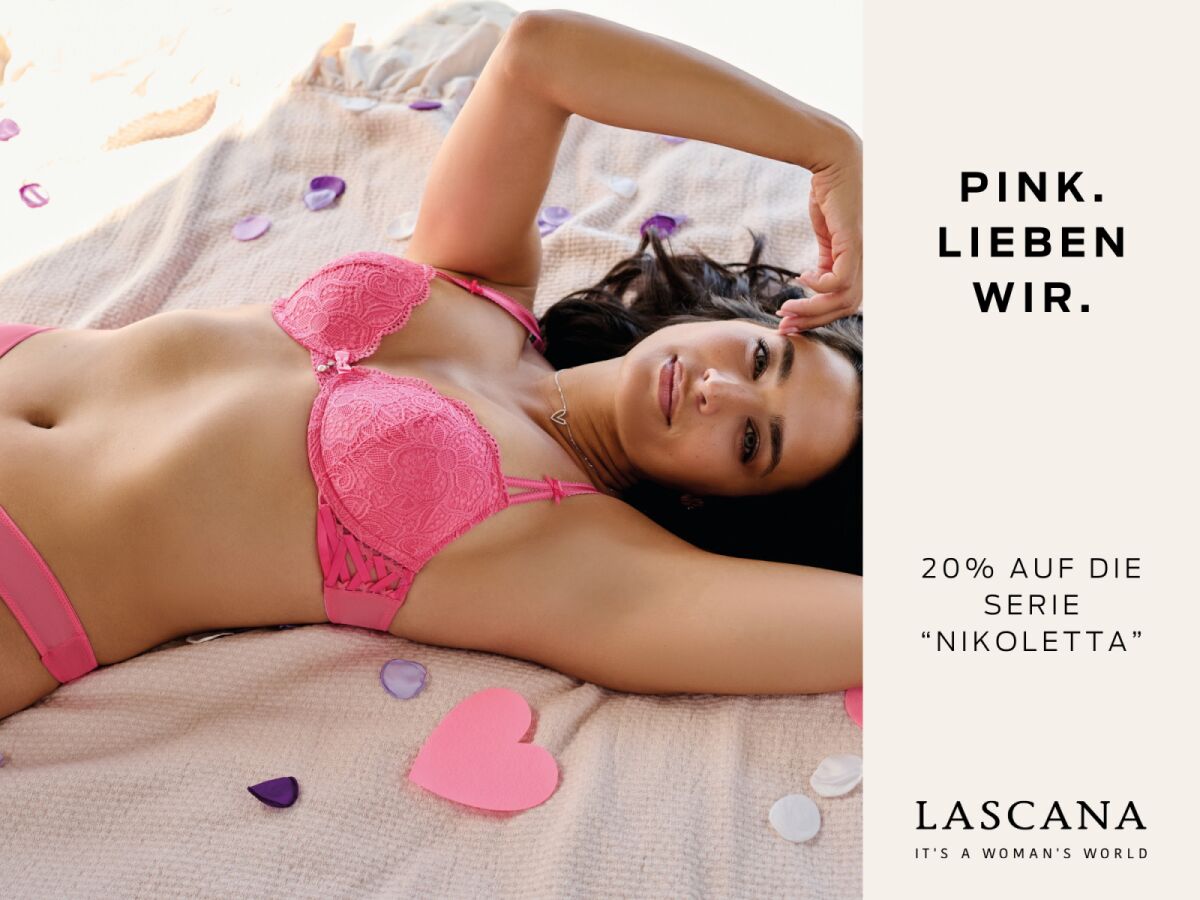 Diese Woche ist Valentinstag. Bei uns erhalten Sie daher vom 09. bis 17. Februar 2026 20% Rabatt auf die pinken Styles der Lascana-Serie Nikoletta: Push-up-BH, Bügel-BH, String und Slip.