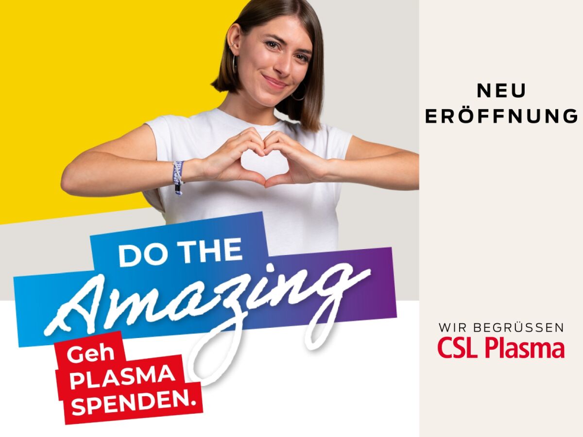 Mit großer Freude und Stolz dürfen wir bekanntgeben: Das weltweit tätige Unternehmen CSL Plasma eröffnet am 24. Juni 2025 ein modernes Plasmaspendezentrum im 3. Obergeschoss.
