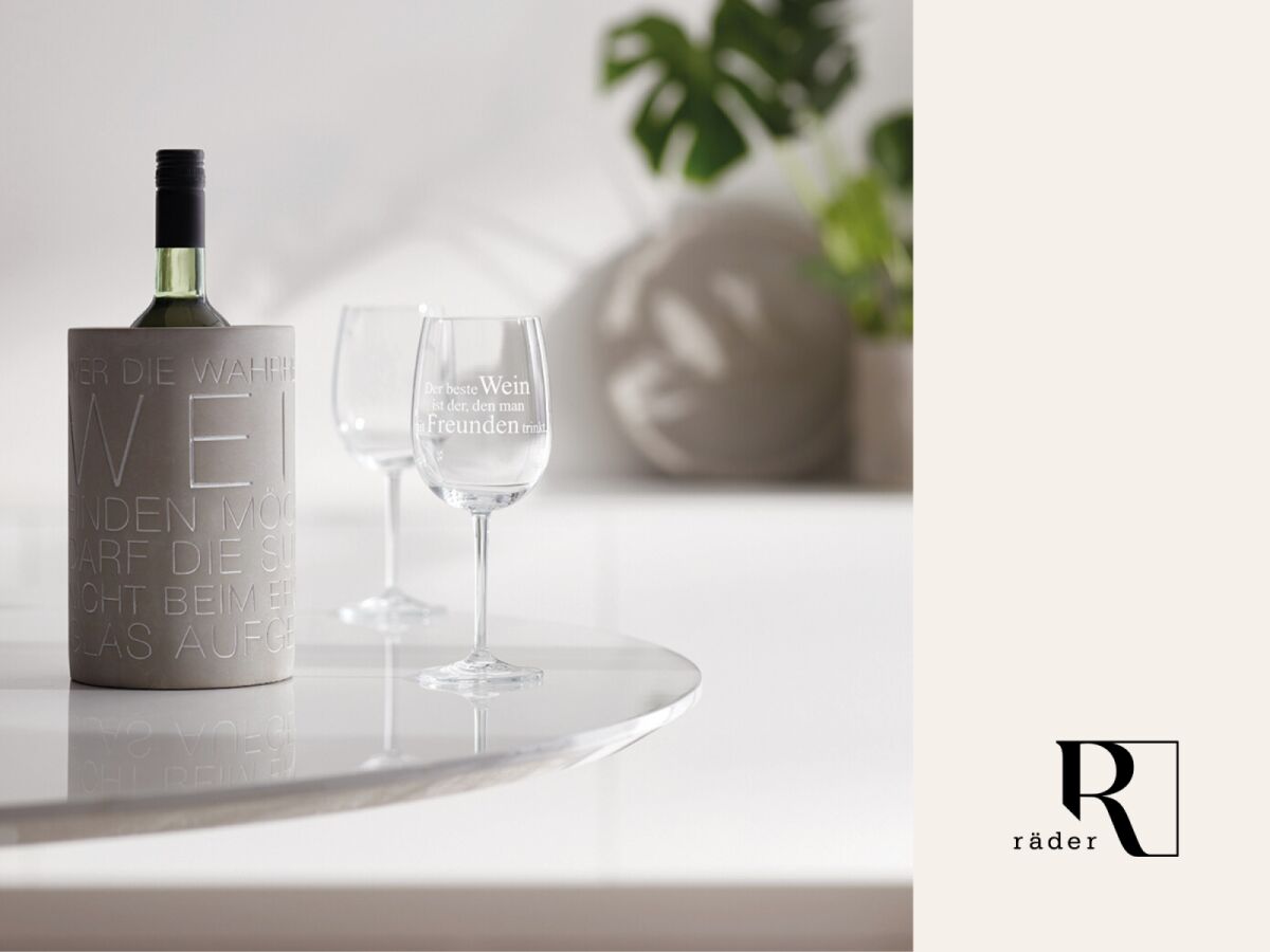Besonders beliebt sind die Produkte von Räder als Geschenke. Sie suchen eine kleine Aufmerksamkeit für Freunde, Nachbarn oder Familie? Vielleicht steht ein Grillabend in der Nachbarschaft an, zu dem Sie eingeladen sind? Dann sind die Weingläser und der passende Weinkühler von Räder die perfekte Wahl. Mit Sprüchen wie „Der beste Wein ist der, den man mit Freunden trinkt.“ oder „Leben, Lachen, Lallen“ wird jedes Glas zum Gesprächsthema – und sorgt garantiert für gute Stimmung am Tisch.