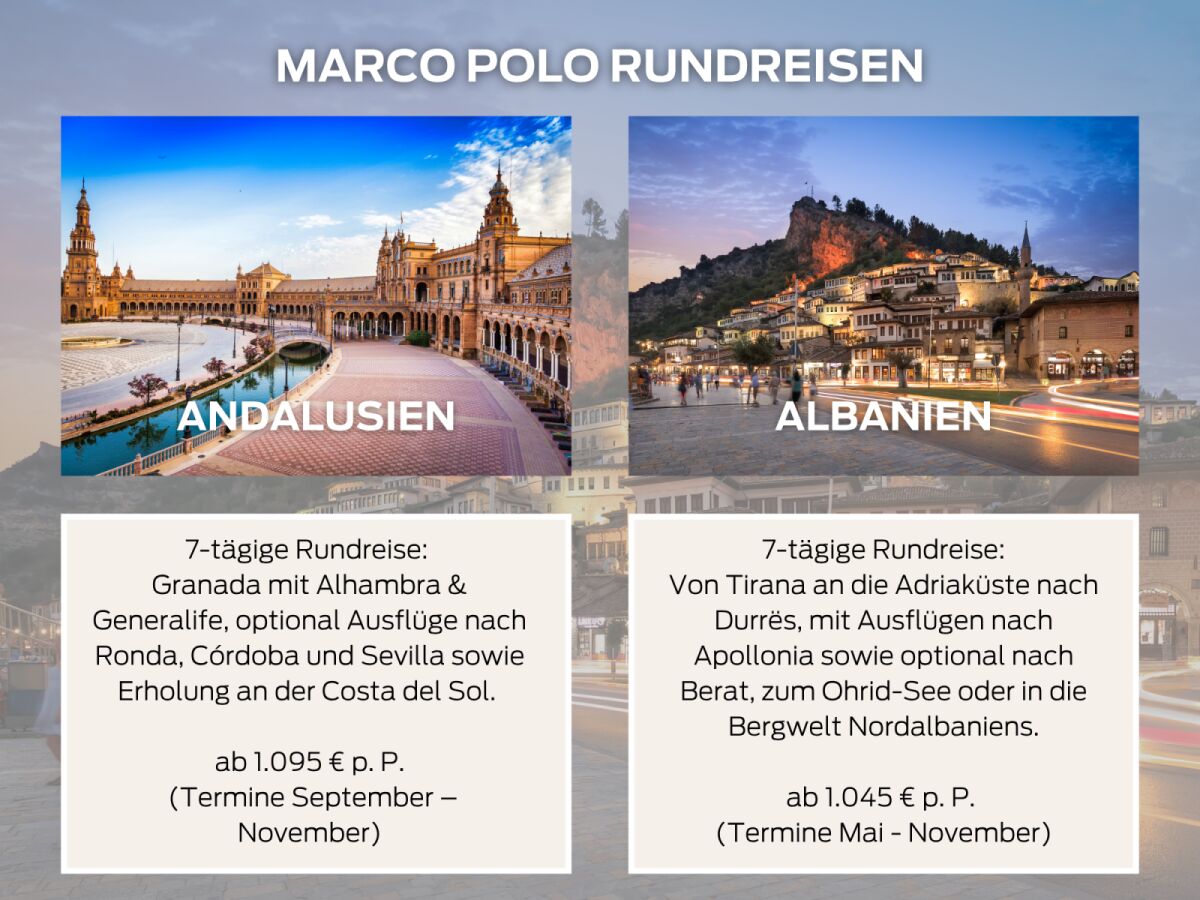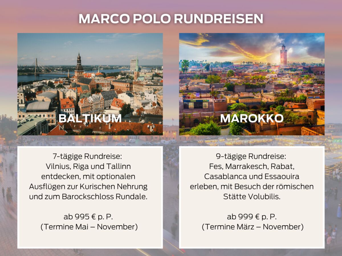Manchmal beginnt eine Reise mit einem einzigen Moment. Ein Sonnenaufgang über einer fremden Stadt, das erste Eintauchen in eine neue Kultur oder ein Augenblick, der bleibt. Mit den aktuellen Angeboten von Marco Polo Reisen entdecken Sie die Welt intensiver – gut organisiert, unkompliziert und mit viel Raum für eigene Erlebnisse.