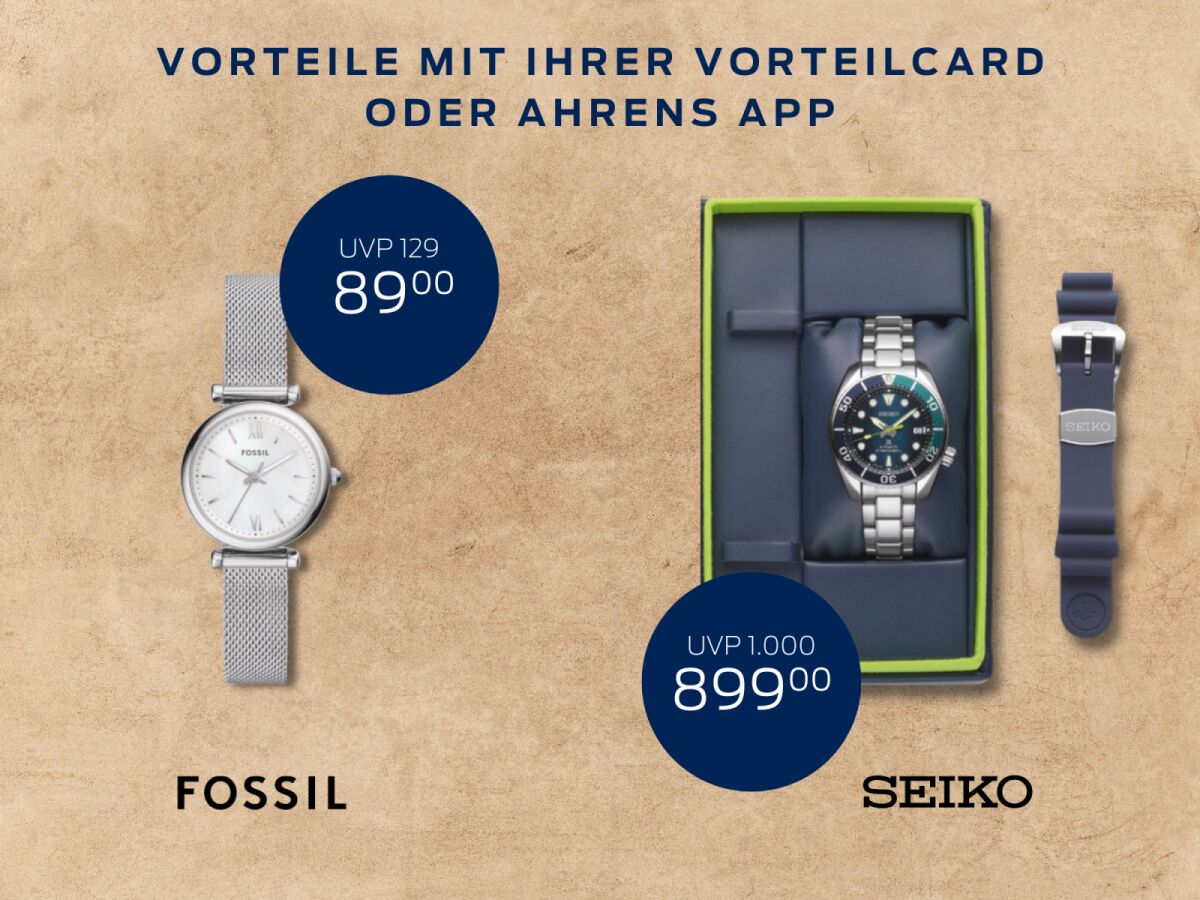 Mit Ihrer VorteilCard oder der neuen Ahrens App genießen Sie besondere Vorteile und können sich exklusive Angebote sichern. Hier ein Vorgeschmack auf unsere aktuellen Schmuck- und Uhren-Highlights: